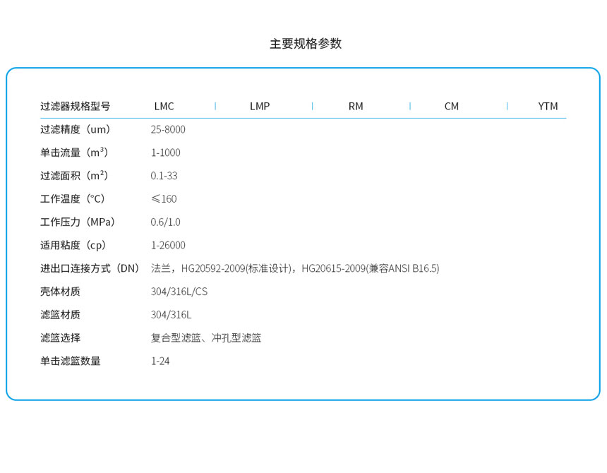 LM过滤器具有结构简洁,操作快捷灵活等特点,过滤器可安装复合滤篮 、冲孔型滤篮,楔形滤篮等过滤元件。LM过滤器细分为5个子系列: